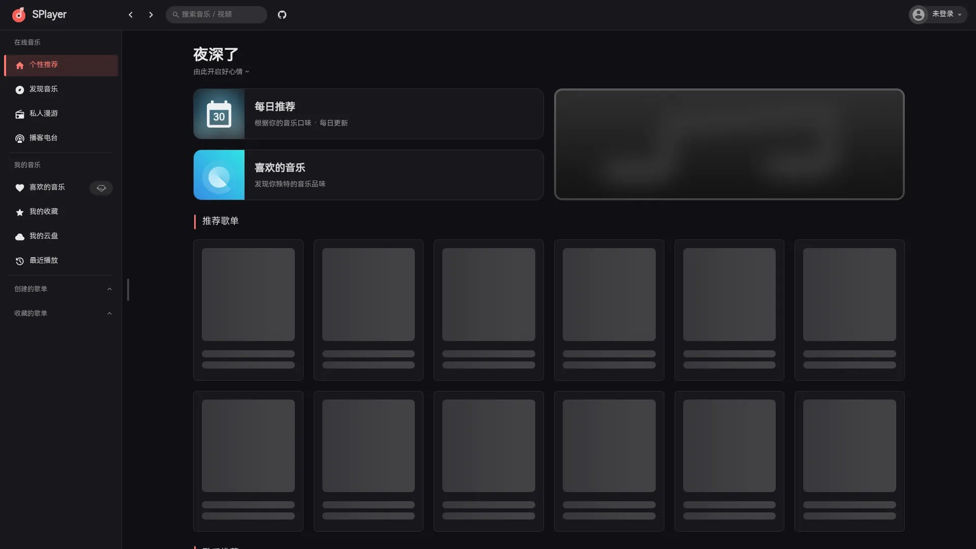 一个简约的在线音乐播放器,具有音乐搜索、播放、每日推荐、私人FM、歌词显示、歌曲评论、网易云登录与云盘等功能