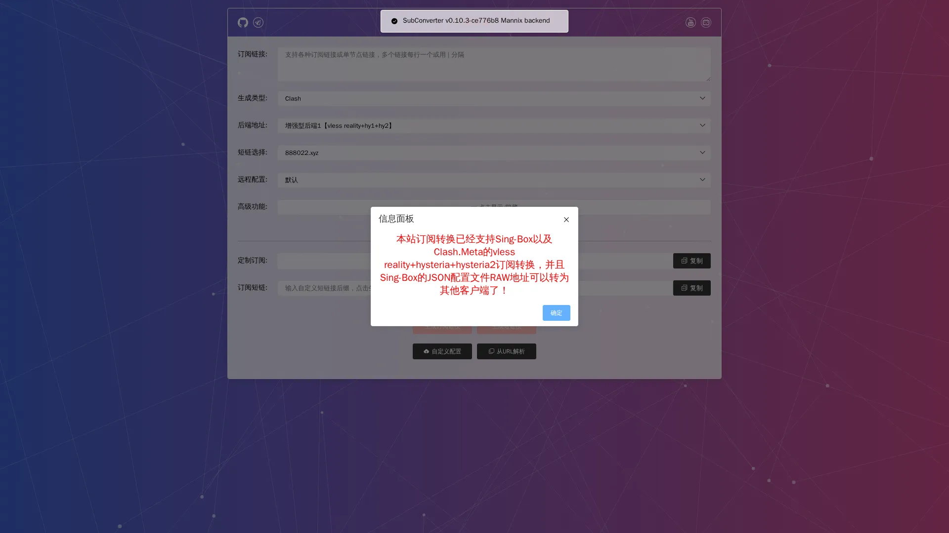 网站域名:sub-eta.vercel.app 更新日期:2026-03-15 网站简称:订阅转换 网站分类:科学上网-机场 人气指数:517 备用链接1 自己搭建 一分机场转换-114514 stymei.cc.cd
